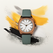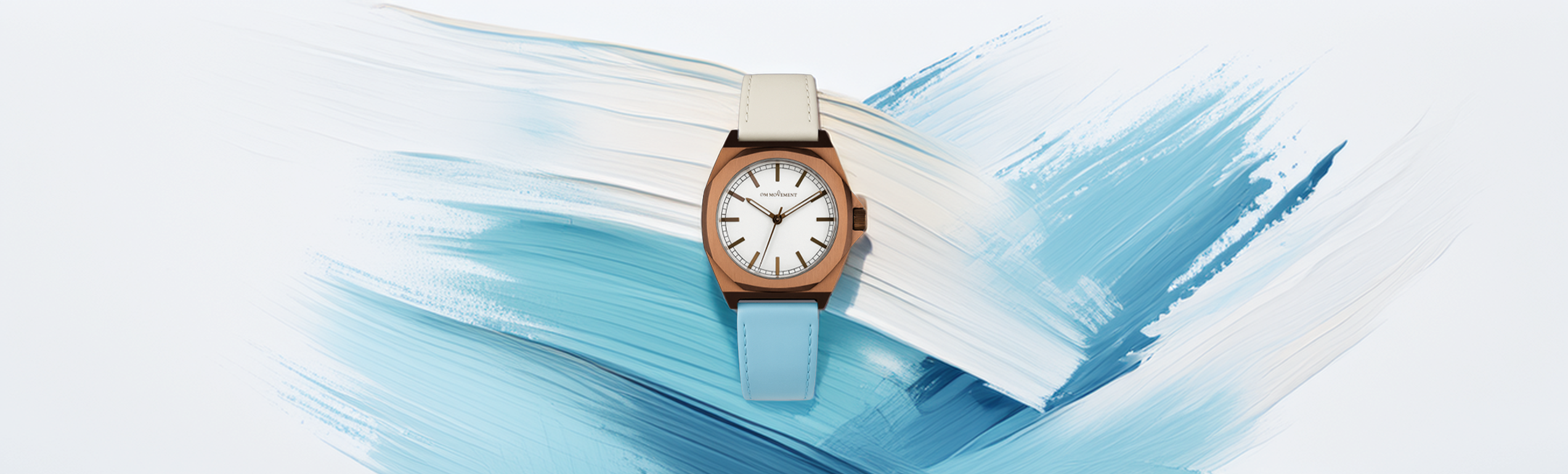 Diese beispielhaft charakterstarke Armbanduhr aus der Rubrik "Gestalte selbst" von OMVT verbindet ein gebürstetes Edelstahlgehäuse mit einem stilvoll zweifarbigen Lederarmband – oben in strahlendem Gelb und unten in elegantem Weiss. Ein harmonisches Zusammenspiel in Kombination mit dem Kupferton des Gehäuses.