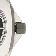 Das kraftvoll gestaltete Gehäuse der OMVT Uhr wird aus gebürstetem Edelstahl gefertigt und verkörpert moderne Uhrmacherkunst mit architektonischem Anspruch.
