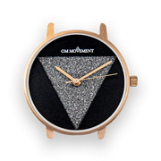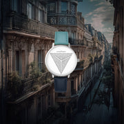 Diese zeitlose und beispielhafte Armbanduhr aus der Rubrik "Gestalte selbst" von OMVT kombiniert ein geometrisch klares Gehäuse mit einem dezenten, zweifarbigen Lederarmband – oben kühles Grün, unten tiefes Blau.