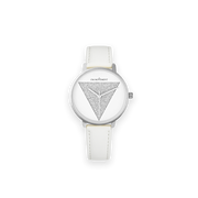 Fein definierte Kanten und symmetrische Linien mit silbernem Hintergrund schaffen auf dem in Weiß gehaltenen Ziffernblatt eine ausbalancierte Formensprache – ein Zusammenspiel aus Stabilität, Reduktion und Stil.