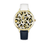 Das runde Gehäuse mit dem hellen Leopardenmuster der OMVT Uhr wird dich in Kombination mit den unterschiedlichen Farbnuancen der edlen Armbänder begeistern.