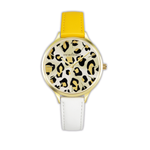 Das runde Gehäuse mit dem hellen Leopardenmuster der OMVT Uhr wird dich in Kombination mit den unterschiedlichen Farbnuancen der edlen Armbänder begeistern.
